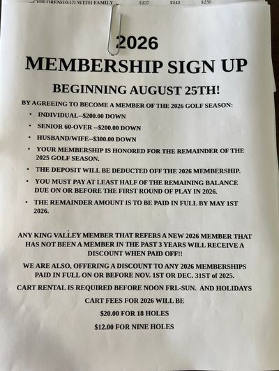2026 Memberships will be available in the clubhouse starting August 25, 2025. Final payment is due by May 1, 2026. Membership purchases made after May 1st must be paid in full at time of purchase.